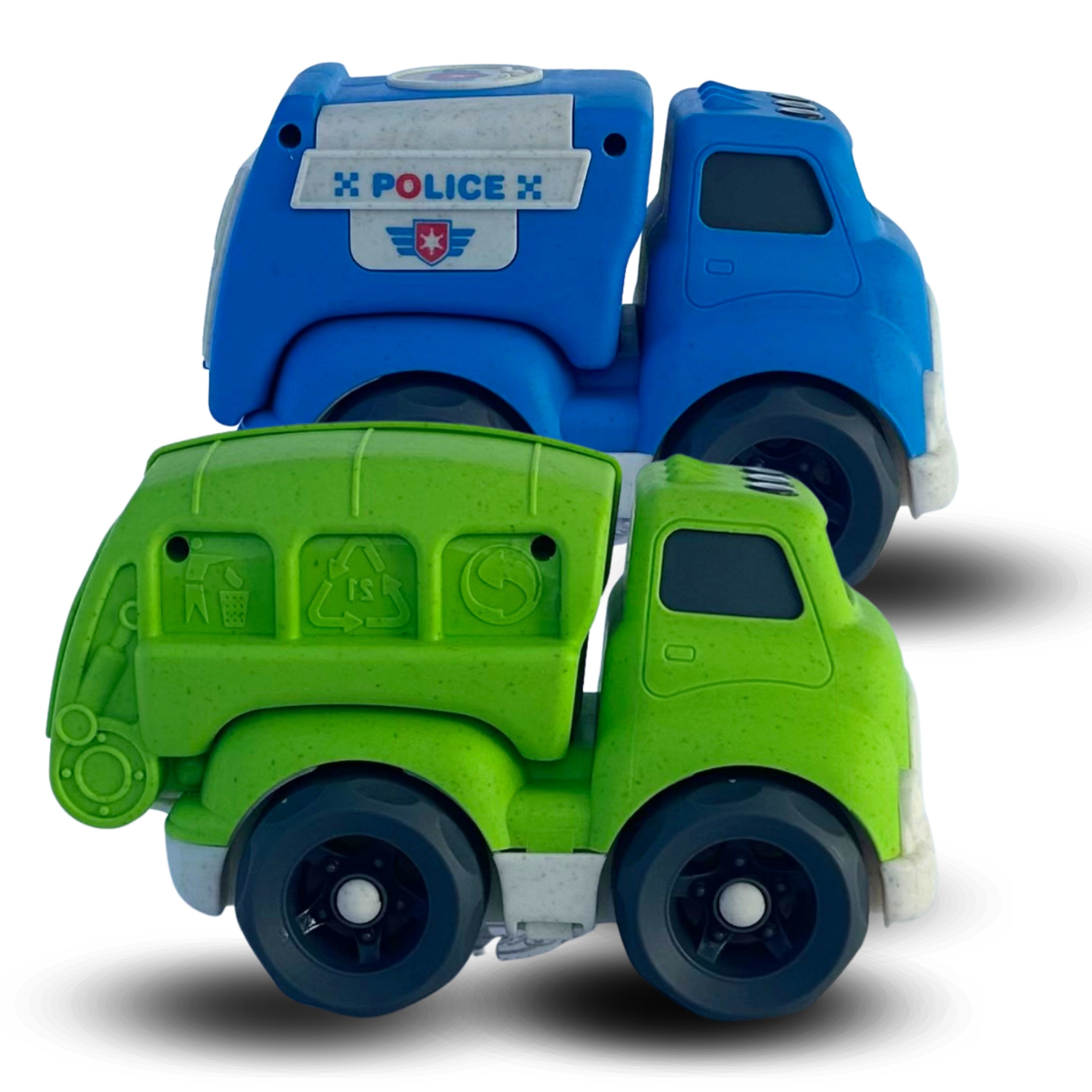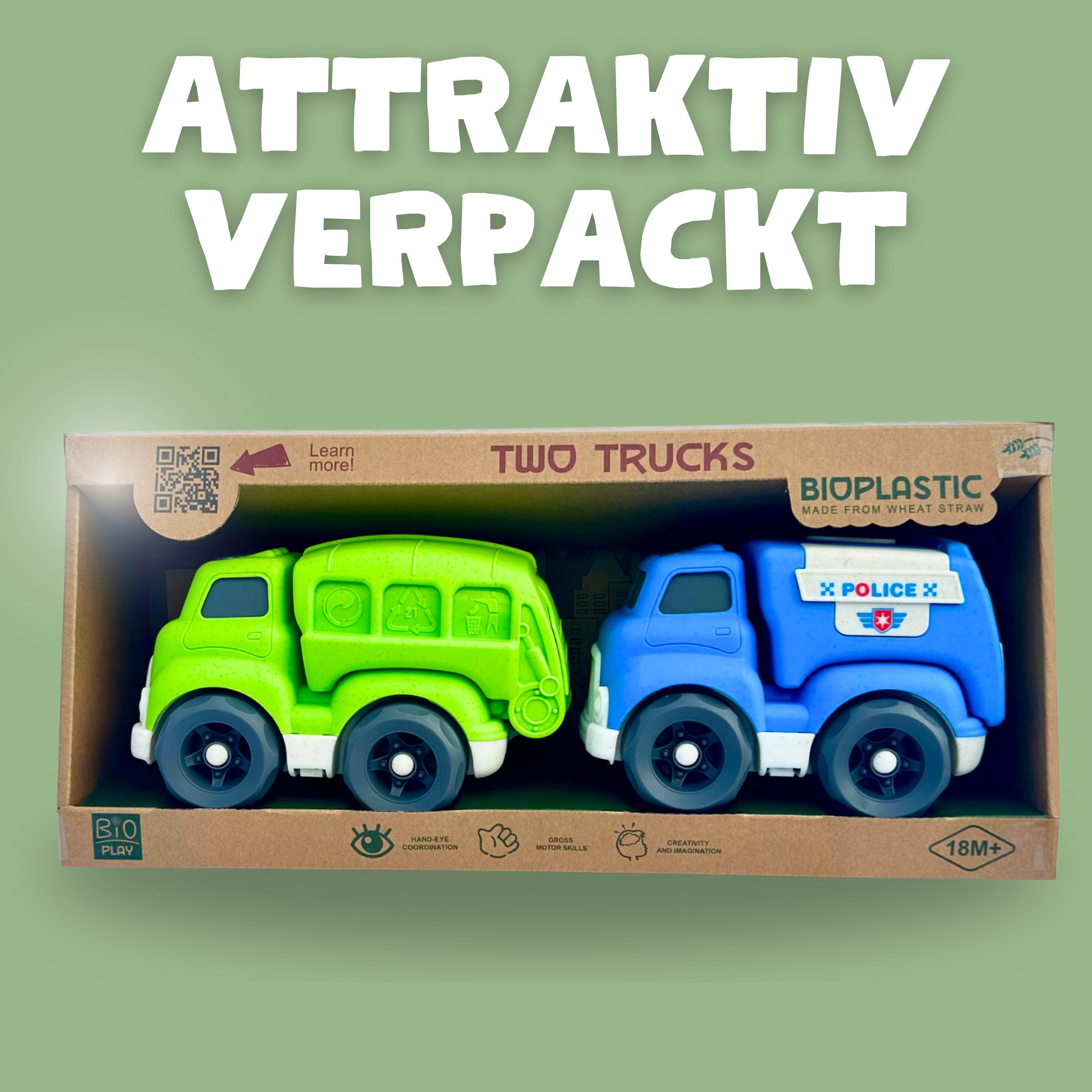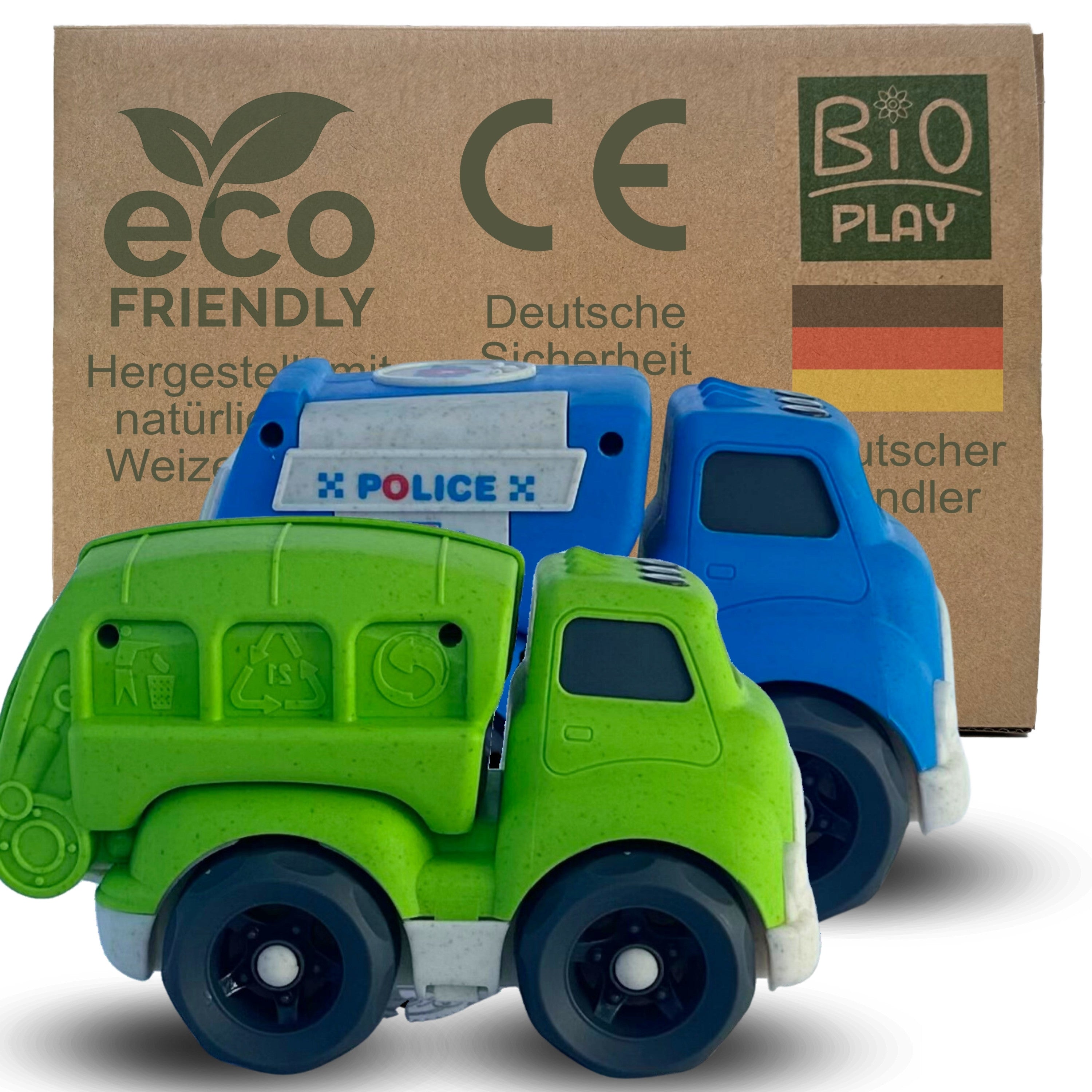 BIOPLAY® Müll & Polizei Truck 2-er Set XL | Bio Kunststoff | Nachhaltiges Spielzeug ab 1 Jahr für Jungen und Mädchen | Indoor und Outdoor | Polizei | Recyclingfahrzeug